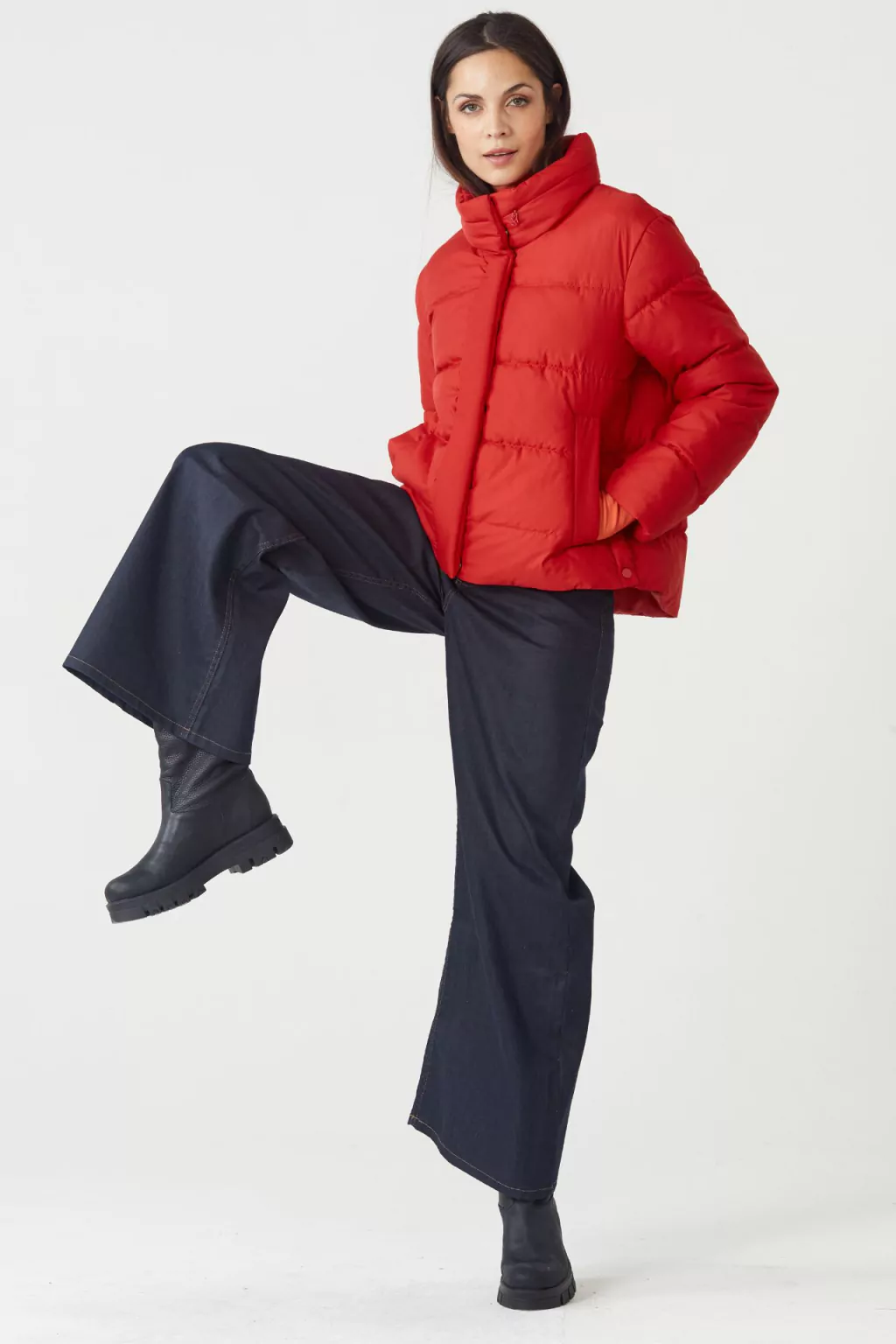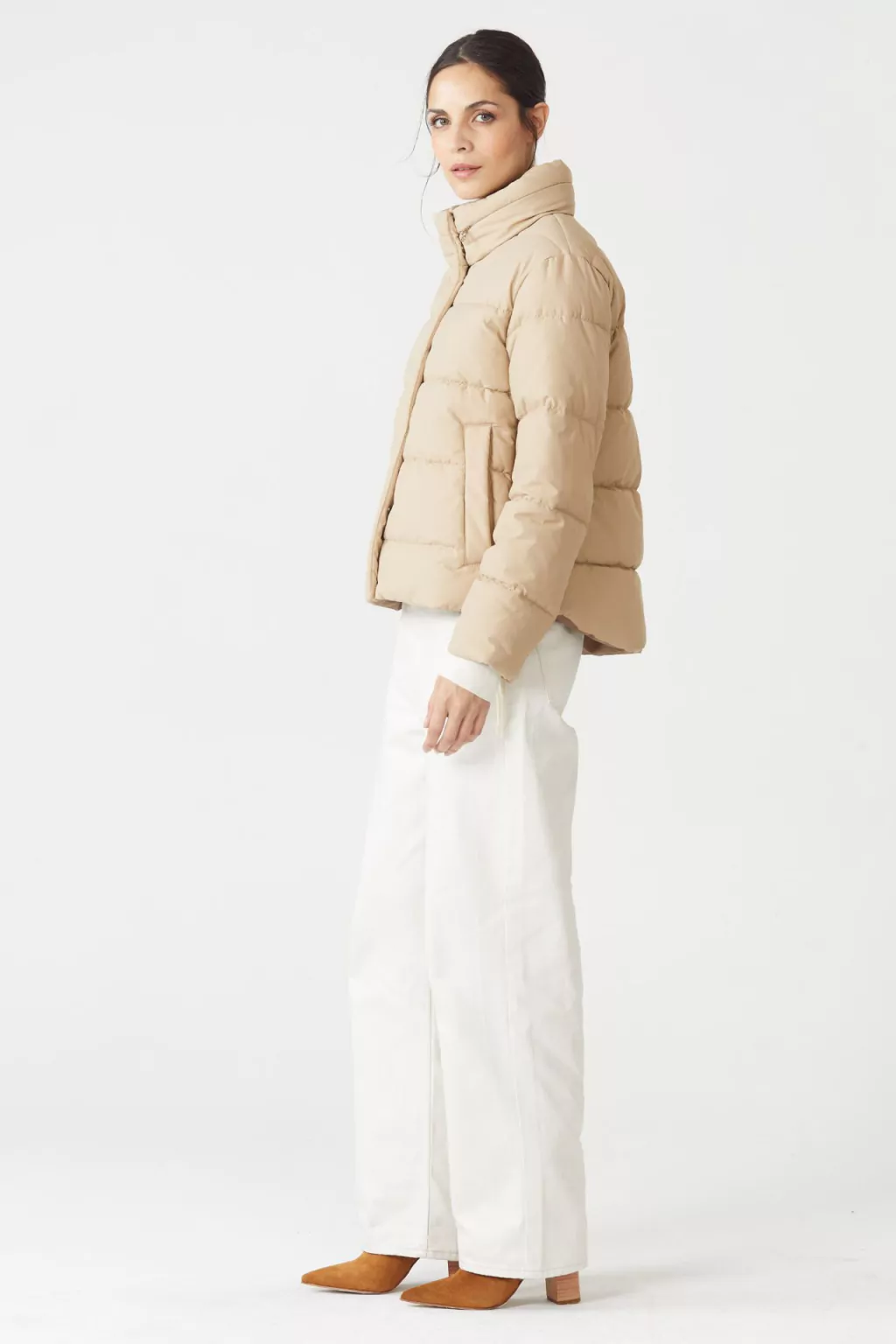 Campera ultra liviana, tipo pluma. Silueta amplia delicada y cómoda. Cuello alto con capucha escondida con apertura por cierre invisible. Género repelente al agua, liviano, tacto suave y opaco. Su novedoso relleno trabajado artesanalmente tipo pluma ecológica es de alto abrigo muy suave y liviano. El acceso es por cierre ancho reforzado y broches escondidos. Tiene bolsillos laterales y tajo con broches. En el interior tiene bolsillos con cierre. La campera se puede lavar en lavarropas.
