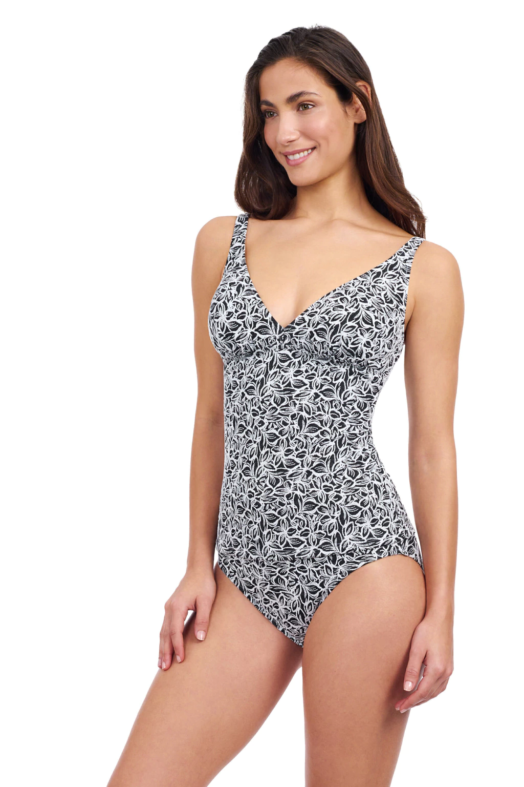 Traje de baño tankini, en dos piezas, musculosa con escote en V y recorte debajo del busto, estampa floral blanca sobre fondo liso. Bombacha tiro alto.